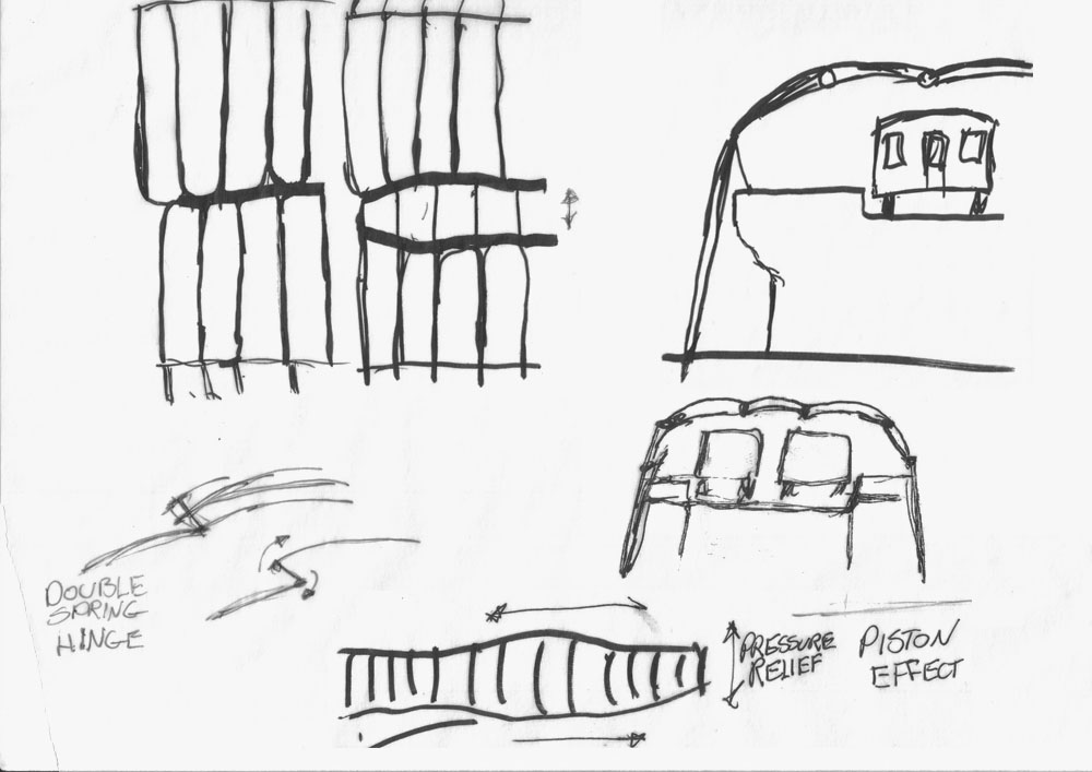 What that dynamic component would do is alleviate the amount of air pressure that occurs when trains enter and exit stations; a sort of air dampening system that would be a part of the structure where it would move and allow an opening for air to enter or escape. The forces acting would be a piston effect, and the idea is that when a train enters the station the force would hit the walls causing it to expand creating an opening to allow pressure to escape. It would create a ripple effect visible outside the station and on the platform.